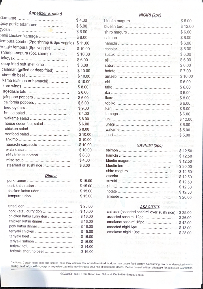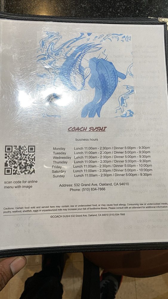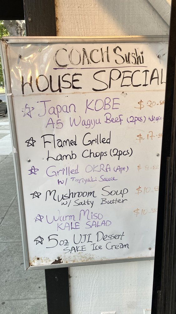 Introducing Coach Sushi, a casual and vibrant sushi spot in Oakland, CA. This restaurant offers a wide range of appetizers, salads, nigiri, and sashimi options to satisfy your sushi cravings. With vegan and vegetarian choices available, there's something for everyone. The ambiance is cozy and intimate, making it perfect for a date night or a quick lunch. Customer reviews rave about the fresh and flavorful dishes, attentive service, and reasonable prices. Standout items include the Bluefin Toro Nigiri, Hamachi Sashimi, and the Cherry Blossom Roll. Don't miss out on the sake menu for a fun drinking game experience. Coach Sushi is a hidden gem worth discovering for sushi lovers and anyone looking for a memorable dining experience.