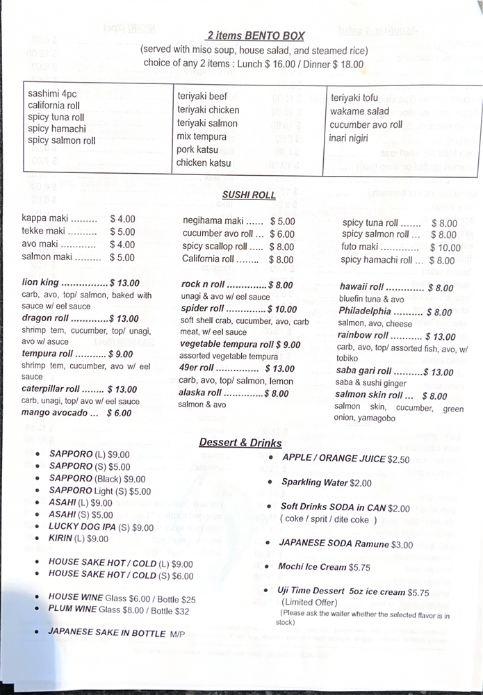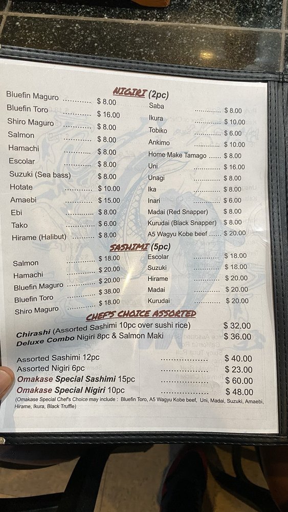 Omakase Special Chef's Choice may include : Bluefin Toro, A5 Wagyu Kobe Beef, Uni, Madai, Suzuki, Amaebi, Hirame, Ikura, Black Truffle
